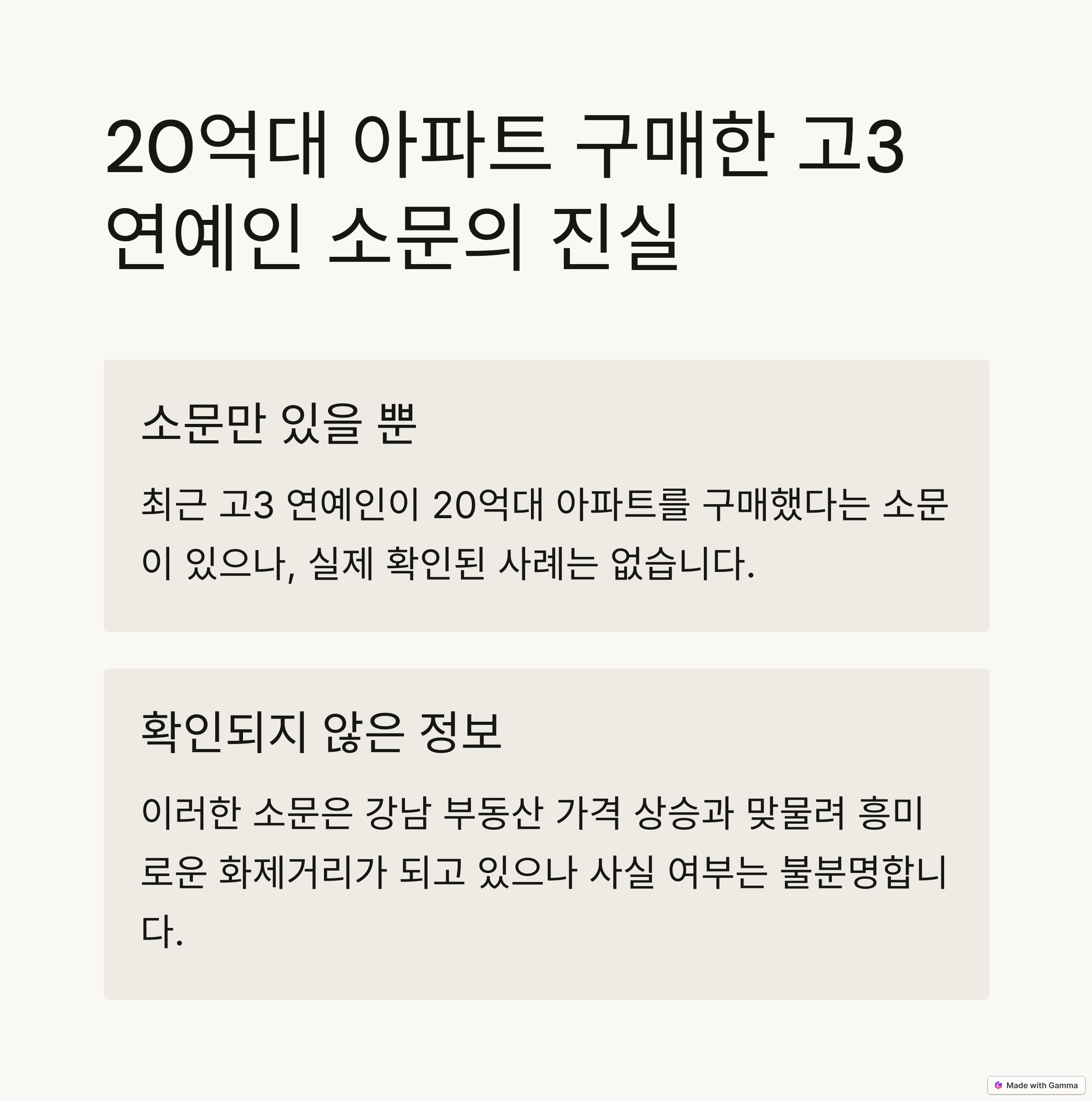 안녕하세요, 부동산 시장과 연예계 소식에 관심이 많으신 여러분! 최근 한 고등학생 연예인이 20억 원대 아파트를 구매했다는 소문이 퍼지면서 큰 화제가 되고 있습니다. 강남 부동산 시장의 급격한 가격 상승과 맞물려, 과연 이 소문의 진실은 무엇인지 궁금해하는 분들이 많으실 텐데요. 오늘은 연예인들의 부동산 투자 사례와 강남 부동산 시장의 동향에 대해 알아보겠습니다.