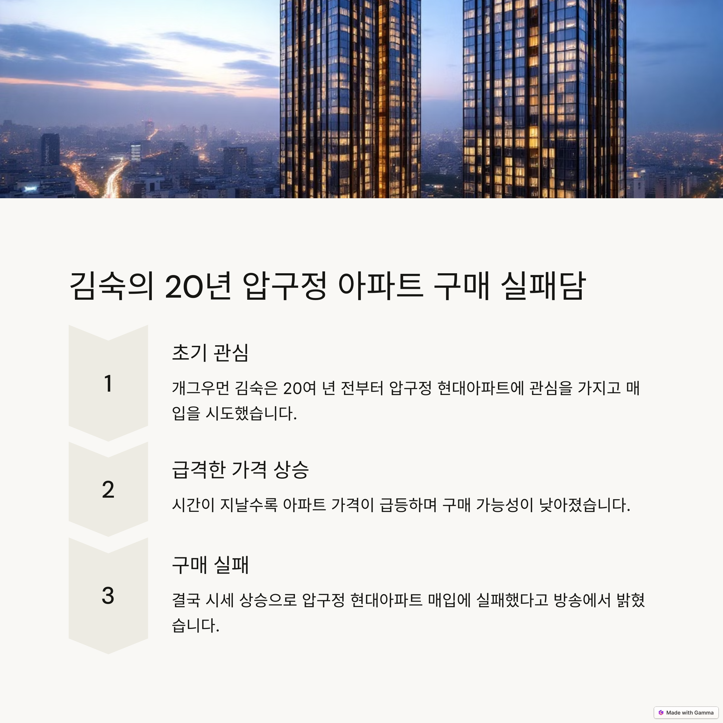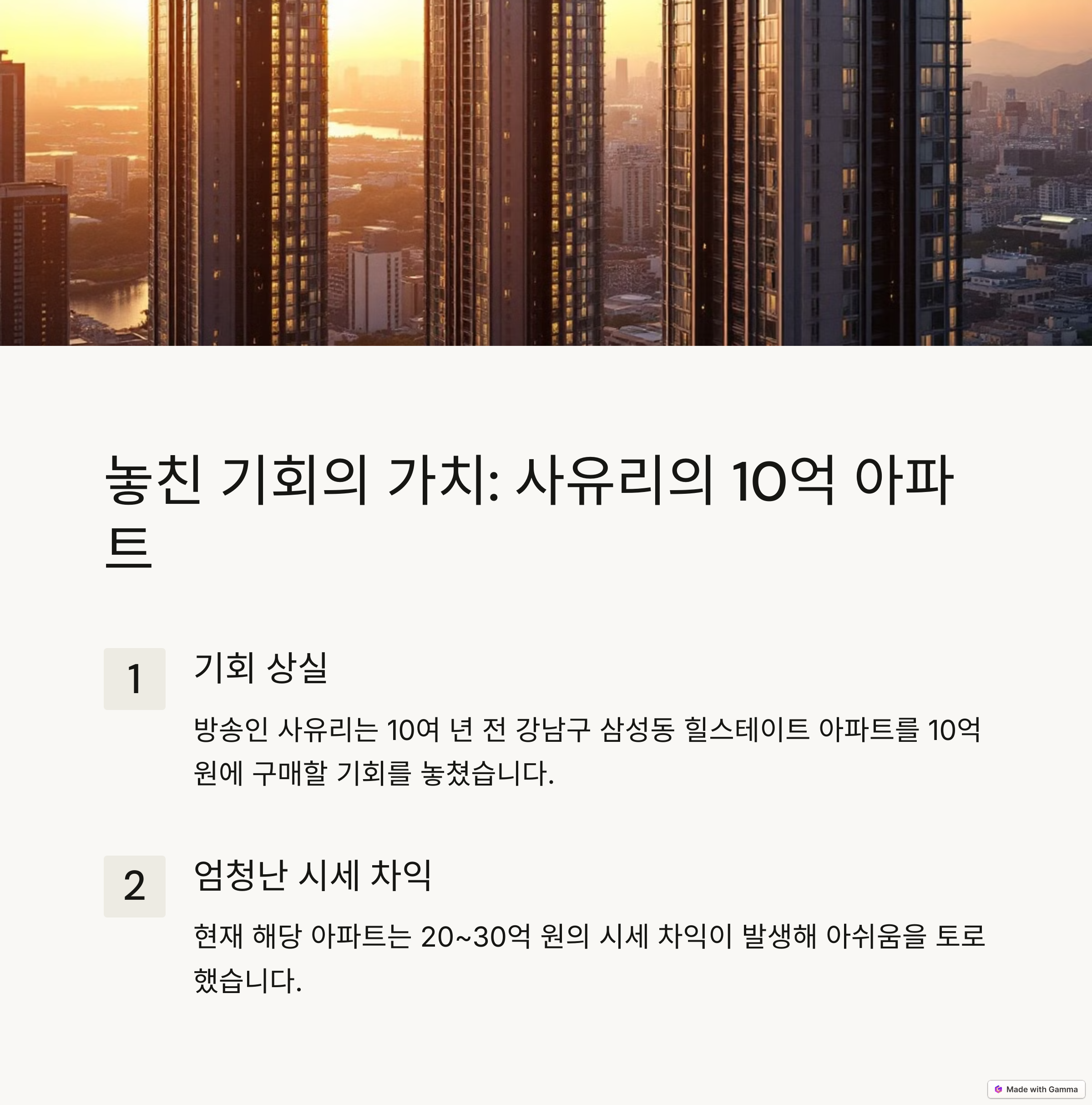 연예인들의 부동산 투자 사례 중 대표적인 예로 일본인 방송인 사유리를 들 수 있습니다. 그녀는 약 10년 전 강남구 삼성동 힐스테이트 아파트를 10억 원에 구매할 기회를 놓쳤는데, 현재 이 아파트의 시세는 무려 20~30억 원대로 상승했습니다. 개그우먼 김숙 또한 20여 년 전 압구정 현대아파트 매입을 시도했지만, 가격 상승으로 인해 결국 매입하지 못했다고 전했습니다. 이처럼 연예인들의 부동산 투자 사례는 시장 흐름을 파악하는 데 중요한 지표가 됩니다.