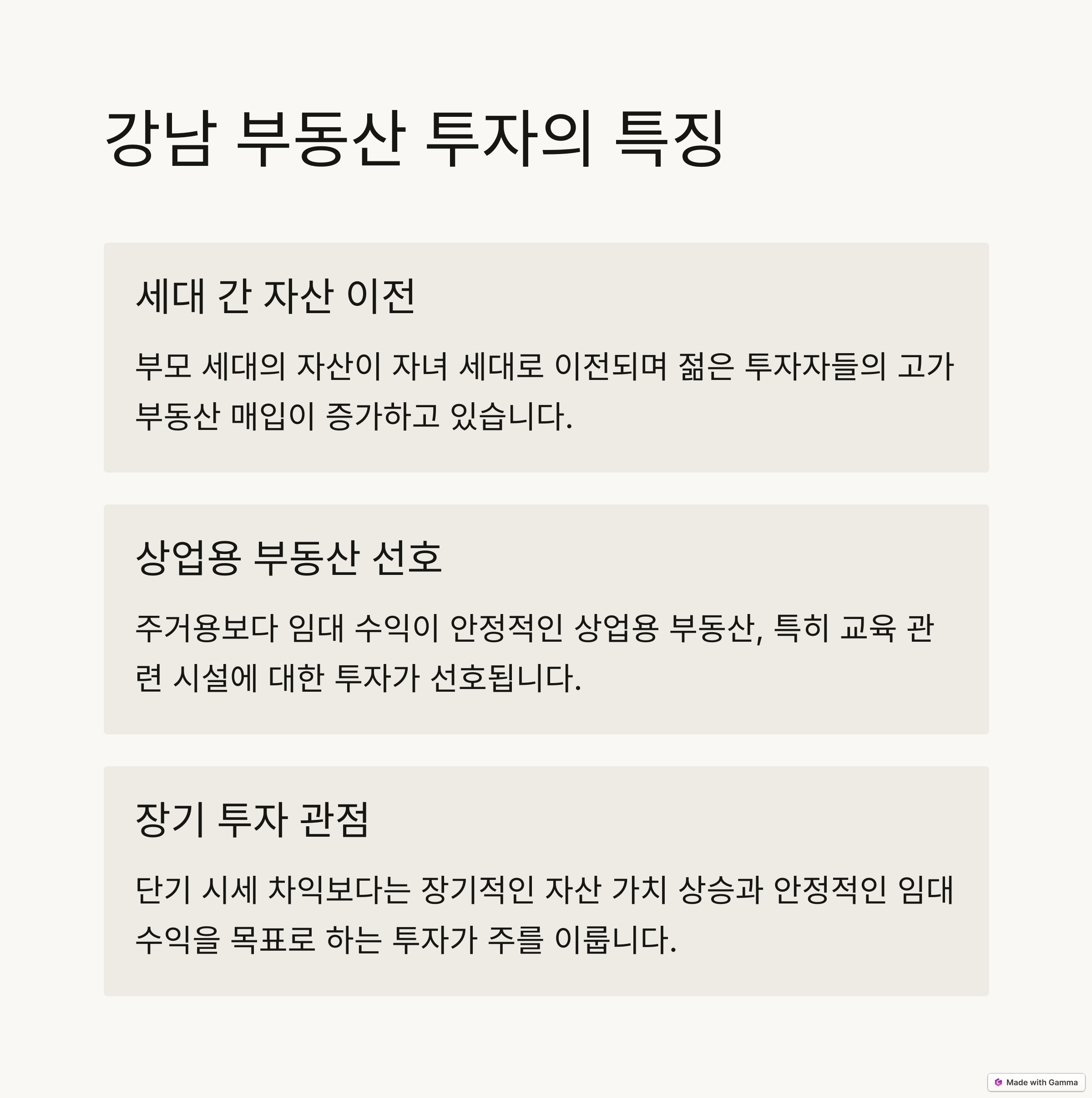 한편, 최근 강남 지역에서는 고소득자들이 주거용 고가 아파트뿐만 아니라 상업용 부동산에도 투자하는 경향이 두드러지고 있습니다. 실제로 한 고3 학생이 부모와 함께 72억 원대의 대치동 학원 건물을 매입한 사례가 있어 큰 화제를 모았습니다. 이는 단순한 주거 목적을 넘어 부동산을 자산 증식 수단으로 활용하는 사례가 증가하고 있음을 보여줍니다.
