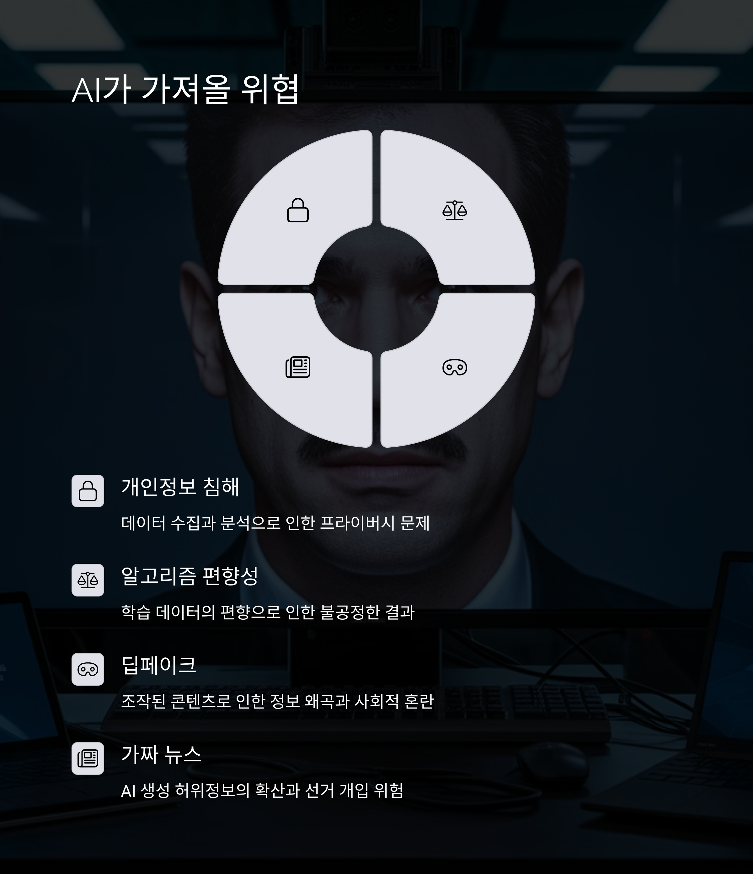AI 기술은 긍정적인 면만큼이나 심각한 위협도 안고 있습니다. 대표적으로 개인정보 침해, 알고리즘의 편향성, 딥페이크로 인한 정보 왜곡 등이 있습니다. 특히 정치, 사회적 영향력이 큰 딥러닝 기반 조작 콘텐츠는 가짜 뉴스 유포와 선거 개입 등으로까지 확산될 위험이 있습니다.