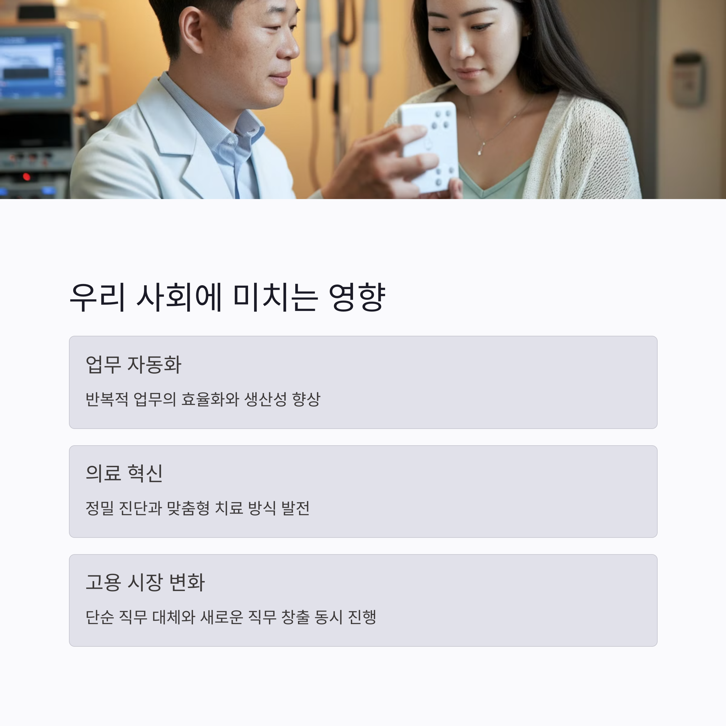 AI는 사회 구조 자체에 큰 영향을 미치고 있습니다. 반복적인 업무 자동화, 정밀 진단을 위한 의료 AI, 금융사기 탐지 알고리즘 등은 이미 실생활에서 활발히 사용 중입니다. 동시에 AI는 고용 시장에도 직접적인 영향을 미치며, 단순 직무를 대체하는 반면, 새로운 직무 창출과 업무 효율성을 크게 높이는 방향으로 나아가고 있습니다.