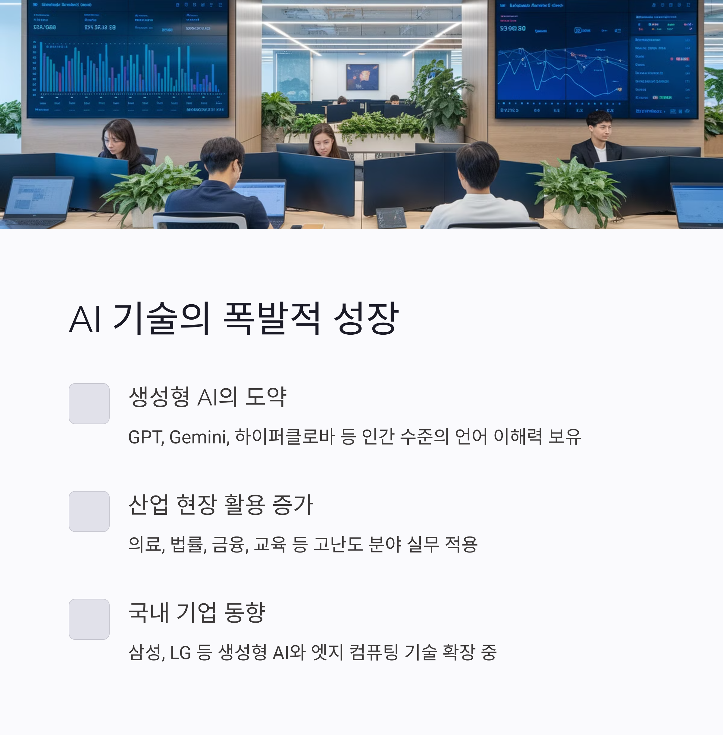 최근 10년간 인공지능(AI)의 발전은 가히 혁명적이었습니다. 특히 2022년 이후 생성형 AI 기술의 도약은 자연어 처리, 이미지 생성, 음성 합성 등 다양한 분야에서 인간과 유사한 수준의 퍼포먼스를 보여주고 있습니다. 예를 들어 OpenAI의 GPT 시리즈, 구글의 Gemini, 네이버 하이퍼클로바는 한국어와 글로벌 언어에 대한 뛰어난 이해력을 갖추고 있어 산업 현장에서의 활용도가 급격히 증가하고 있습니다.
