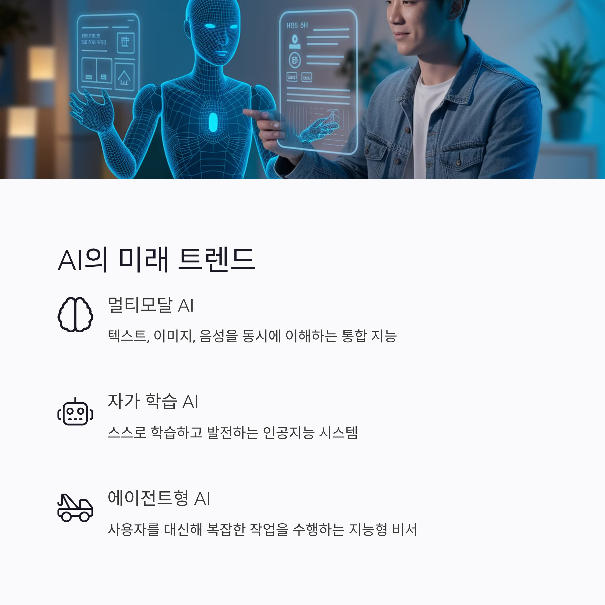 현재 인공지능 기술은 머신러닝과 딥러닝을 중심으로 빠르게 진화하고 있습니다. 초거대 AI 모델은 수십억 개의 파라미터를 바탕으로 문맥을 이해하고 예측하는 능력을 보유하고 있으며, 의료, 법률, 금융, 교육 등 고난도 분야에서도 실무에 적용되고 있습니다. 앞으로는 멀티모달 AI, 자가 학습(Self-Learning) 기반 AI, 에이전트형 AI가 주류를 이룰 것으로 전망됩니다.