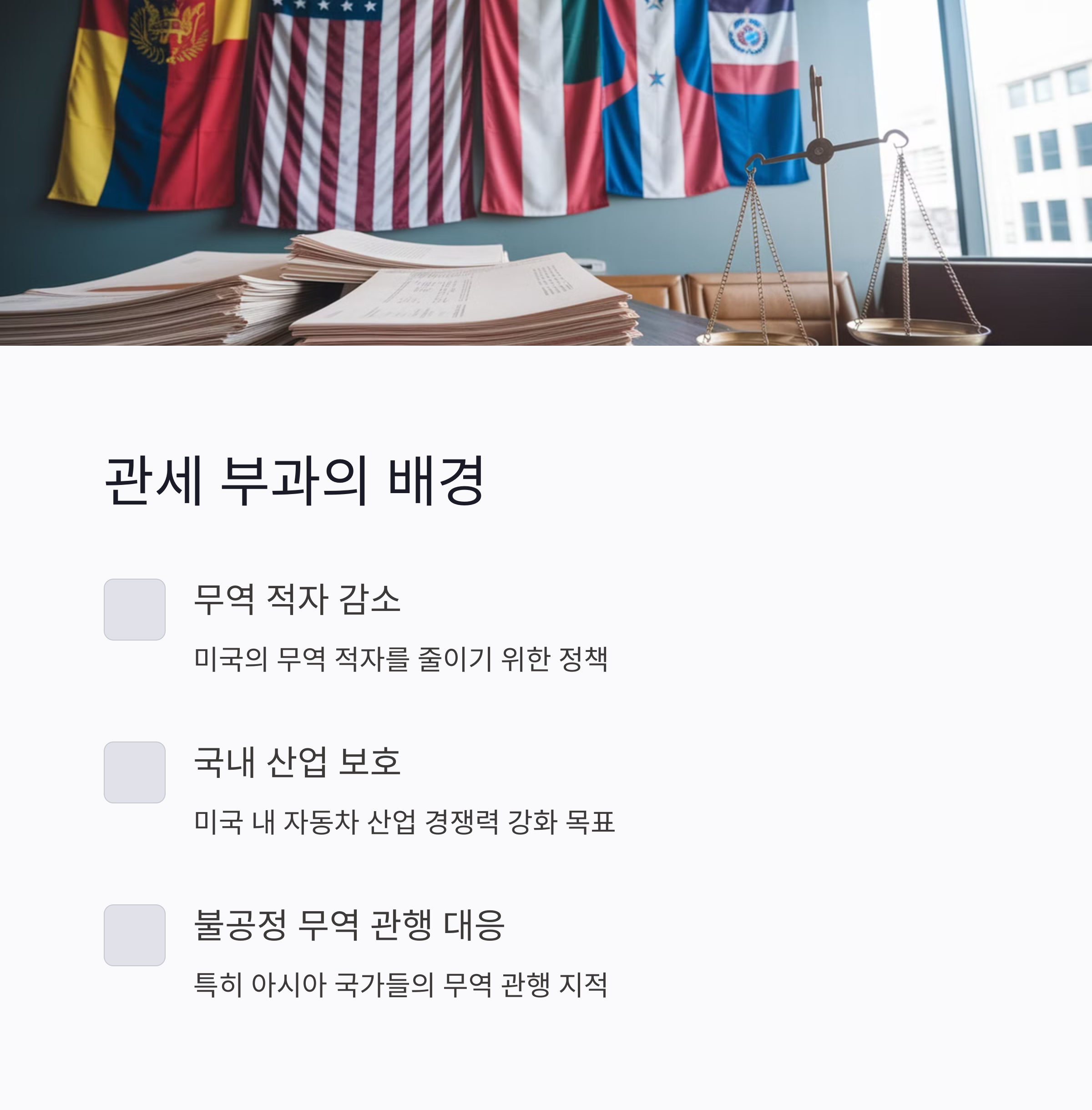 | 25% 관세 부과와 미국의 보호무역 확대 | 수입차 가격 상승과 브랜드 대응 전략 | 무역 갈등과 글로벌 공급망 재편 |