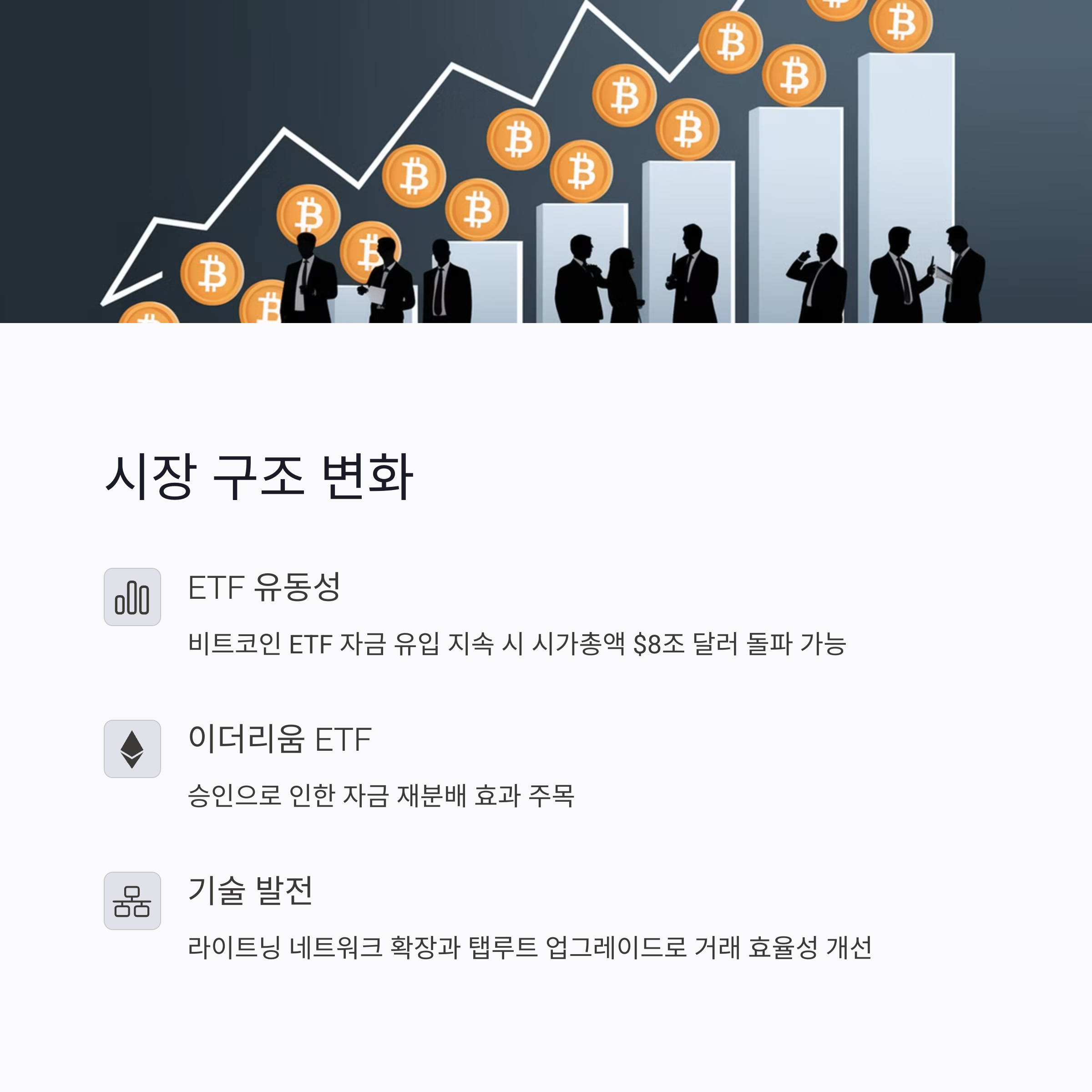 ETF와 기술 발전도 중요한 시장 변수로 작용합니다. 2024년 승인된 비트코인 ETF에 대한 자금 유입은 시가총액 확대에 큰 기여를 할 수 있으며, 이더리움 ETF 출현이 자산 재분배 현상을 일으킬 수 있습니다. 아울러 라이트닝 네트워크의 확장과 탭루트 업그레이드가 완료되면서 비트코인의 실사용성과 효율성도 개선되고 있어, 이는 장기적인 상승 기반을 더욱 공고히 해줄 것입니다. 단, 반감기 이후 채굴자 매도와 금리 정책은 여전히 변동성 요인으로 작용할 수 있기에 주의가 필요합니다.