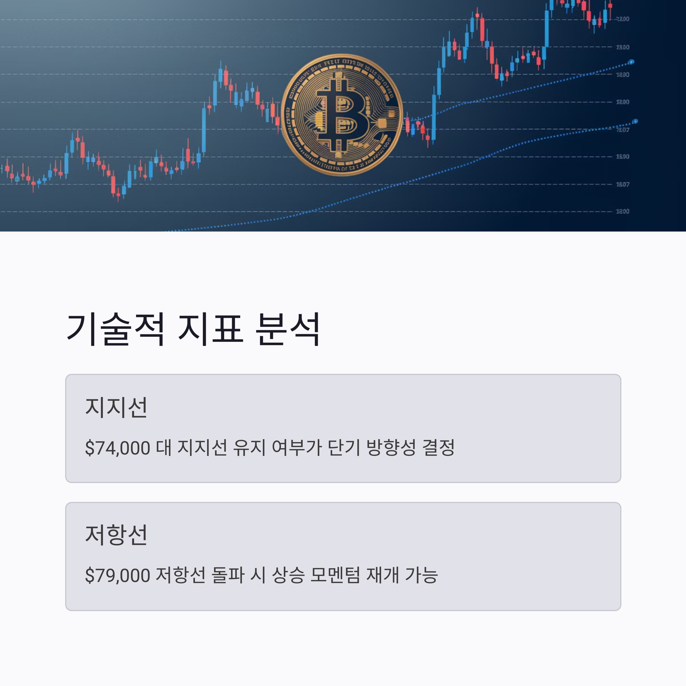 | $74,000 지지 여부가 단기 추세 좌우 | 트럼프 행정부 친암호화폐 정책 기대 | ETF 자금 유입 시 $8조 시총 기대 |