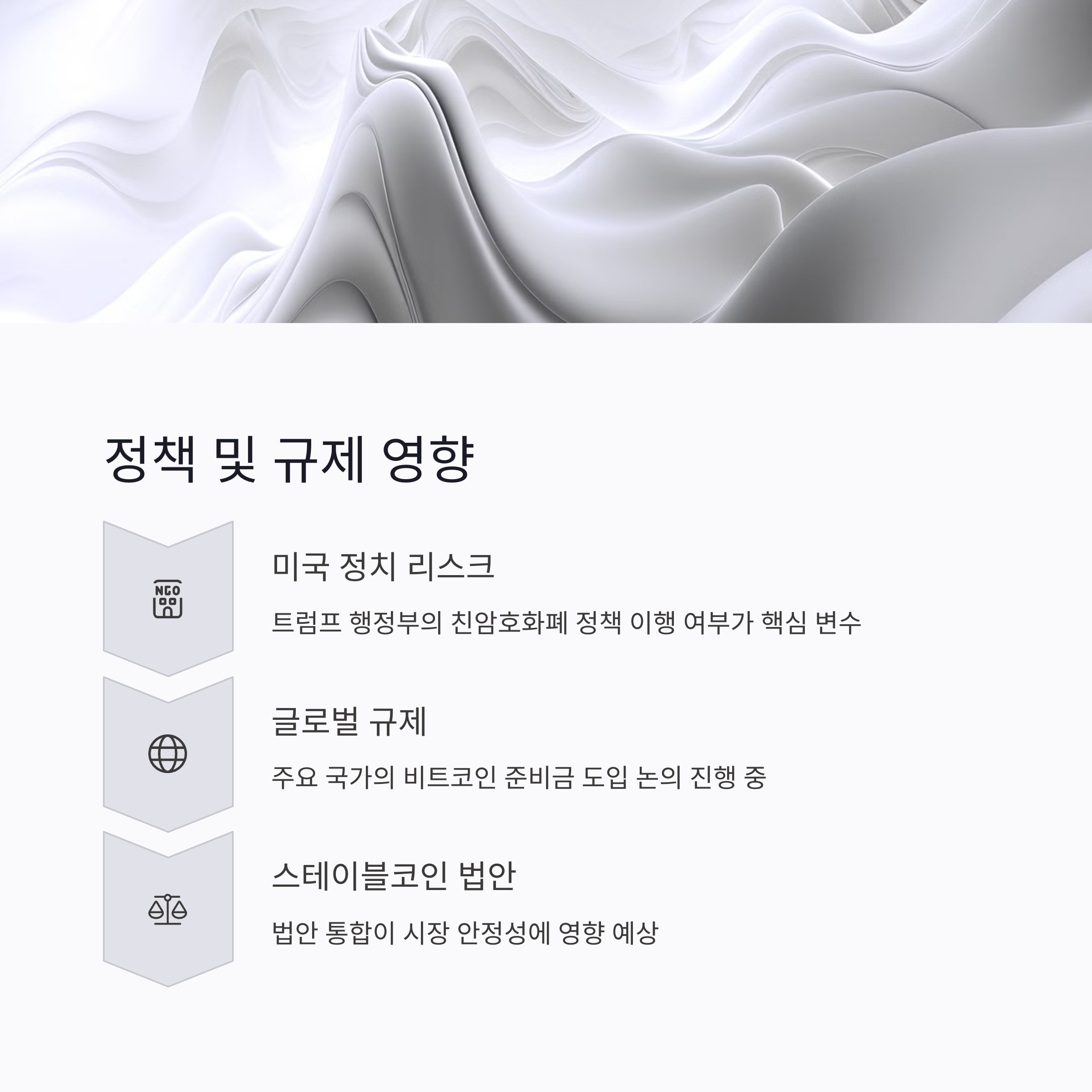 정책과 규제 측면에서는 미국의 대선 결과가 중요한 변수로 작용할 것으로 보이며, 트럼프 행정부의 재집권 시 친암호화폐 정책이 비트코인 상승에 긍정적 영향을 미칠 수 있습니다. 반면, 정책이 실패하거나 글로벌 규제가 강화된다면 하락 요인으로 작용할 가능성도 존재합니다. 특히 스테이블코인 관련 법안과 각국의 준비금 채택 여부는 시장 안정성과 직결되는 요소로, 투자자들은 이를 꾸준히 주시해야 합니다.