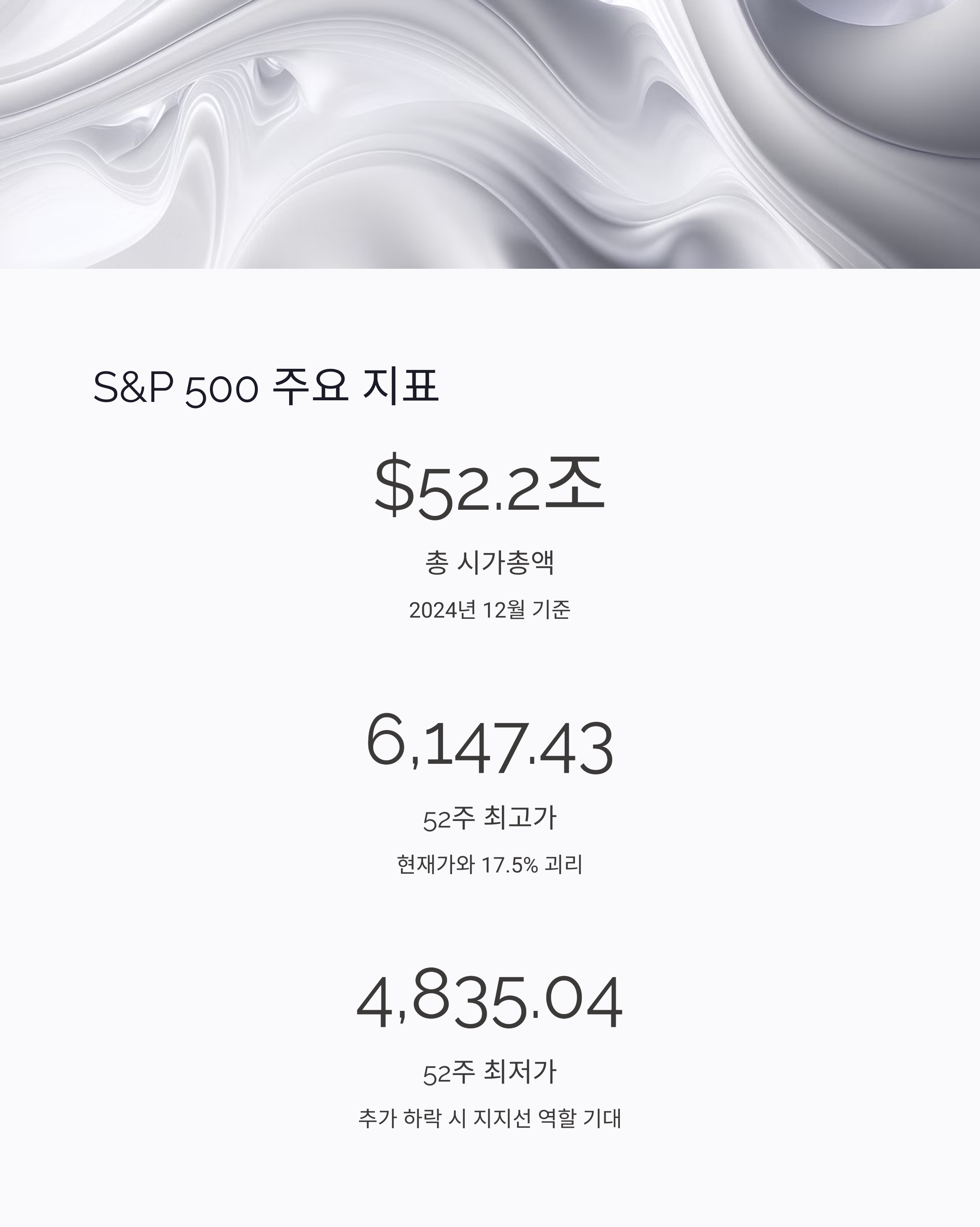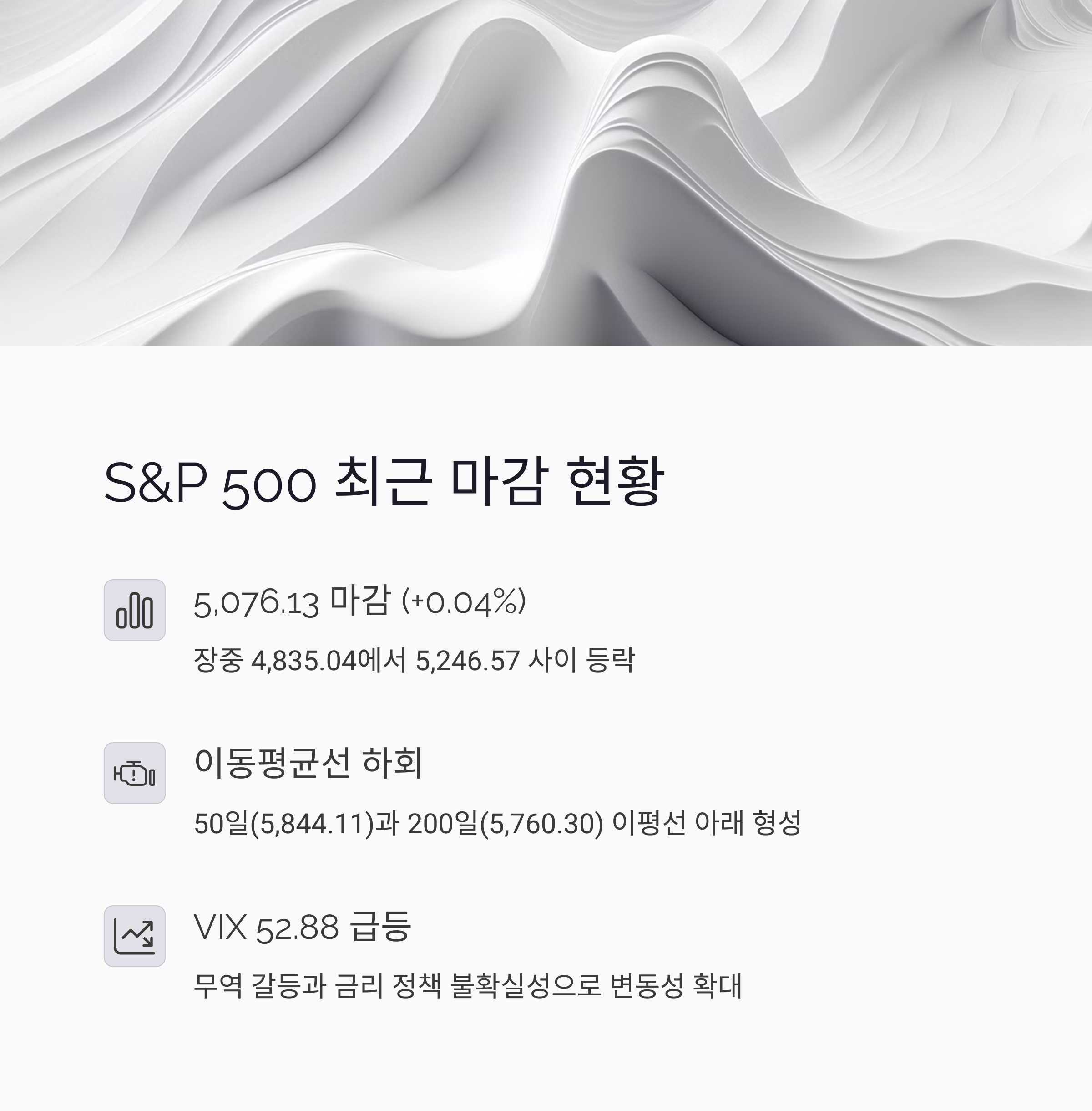 글로벌 금융시장은 예측 불가능한 지정학적 요인과 정책 변화에 민감하게 반응하고 있으며, 최근 S&P 500 지수의 흐름도 이러한 변동성을 그대로 반영하고 있습니다. 특히 2025년 4월 7일 기준으로 소폭 상승한 5,076.13에 마감한 것은 의미 있는 데이터입니다. 그러나 세션 내 4,835.04에서 5,246.57까지 넓은 변동폭을 기록한 점은 투자자들에게 안정적인 흐름보다는 불확실성을 시사합니다. 무역 전쟁, 금리 정책, 거시경제 지표들이 얽히며 단기적인 흐름은 물론 중장기적 방향성에도 적지 않은 영향을 줄 것으로 보입니다. 본 포스트에서는 S&P 500 지수의 최근 성과와 구조, 시장 리스크 요인을 정리하여 독자들이 현명하게 시장을 해석할 수 있도록 돕고자 합니다. 실제 수치와 데이터 중심으로 바라보며 시장의 본질에 접근해보세요.