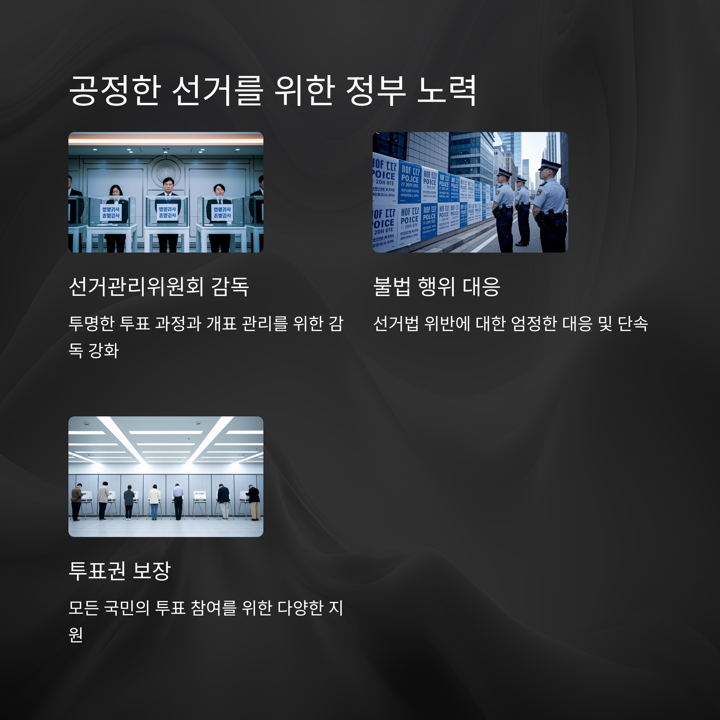 정부는 이번 선거의 공정성과 투명성을 위해 행정안전부와 선거관리위원회의 협력을 강화하고 있습니다. 불법 선거운동 및 금품 수수 등 위법 행위에 대한 엄정한 대응이 예고되어 있으며, 국민의 투표권 보장을 위한 제도적·행정적 지원도 다각도로 마련되고 있습니다. 이러한 노력은 민주주의 수호와 국민의 정치적 권리 실현이라는 큰 틀 속에서 매우 중요한 기반이 됩니다.